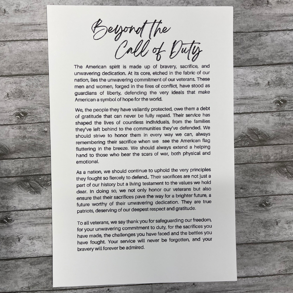This charm comes with a beautiful card with the story of honoring the commitment, battles, and bravery of our veterans. The charm measures approximately 4" x 3.5".