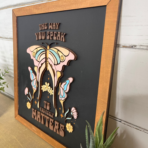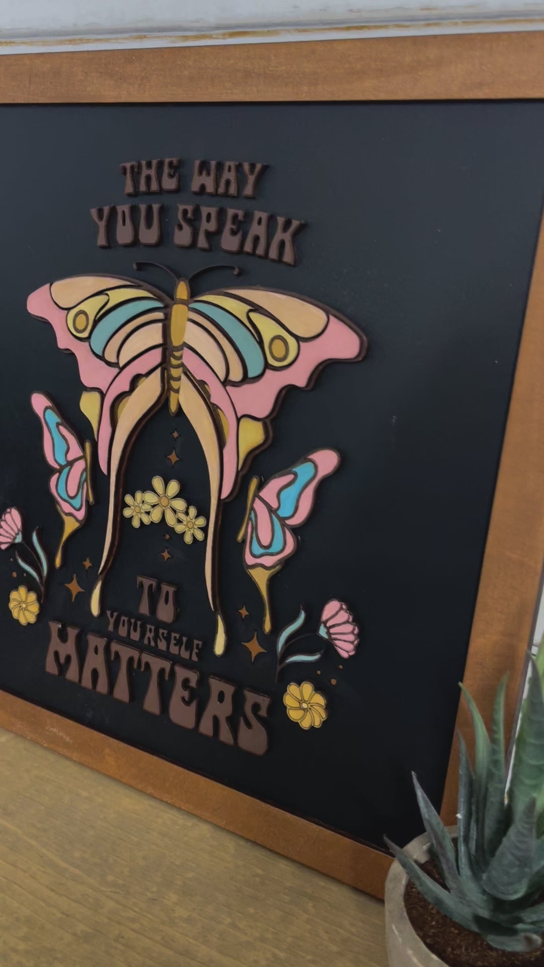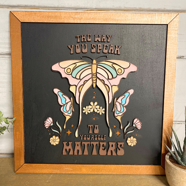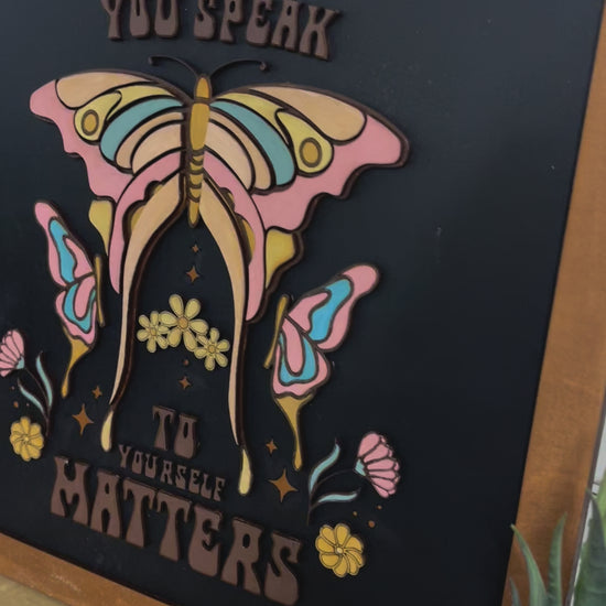 Transform your space and uplift your spirit with "The Way You Speak to Yourself Matters" art piece! This boho-inspired, multi-dimensional design is a true showstopper, featuring a stunning 3D effect that brings positive affirmations to life. Hand painted with love, each piece is part of an exclusive collection of 8 designs, all harmoniously united by common colors that will brighten any room.