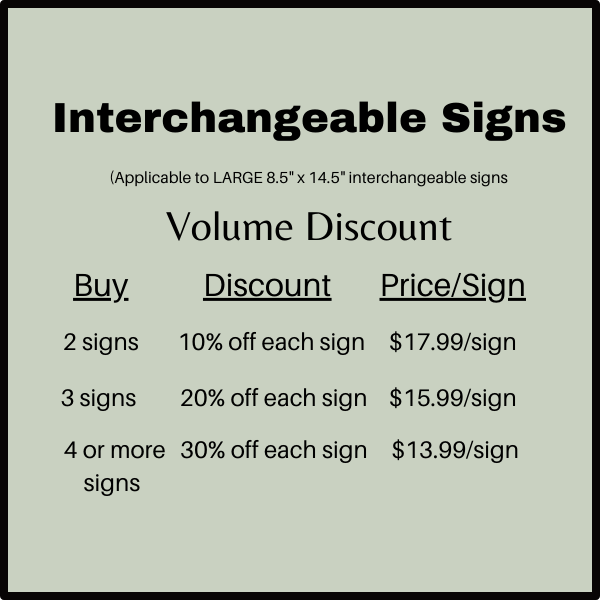- Buy 4 or more signs = 30% off each sign ($13.99/sign)