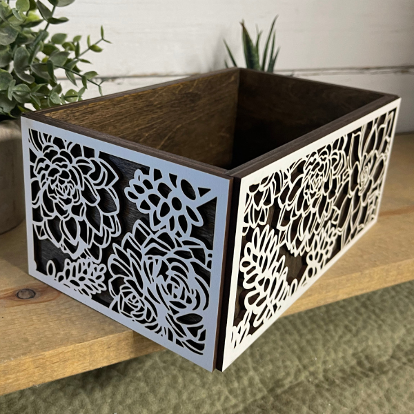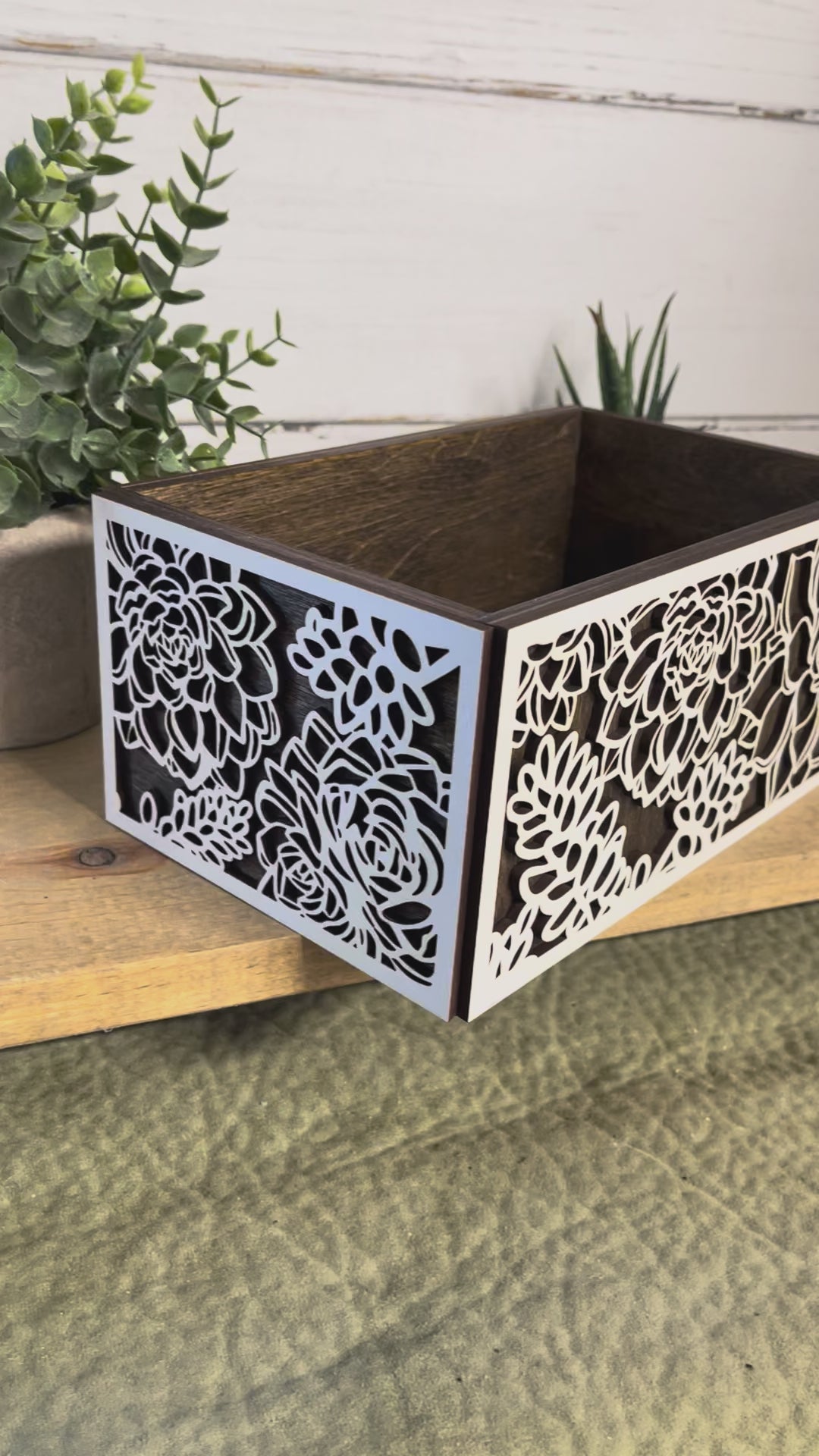 This container is crafted with a rich walnut stain, with a white outer floral layer on all four sides. It’s not just functional - it’s also an eye-catching piece that will add charm to any room.
